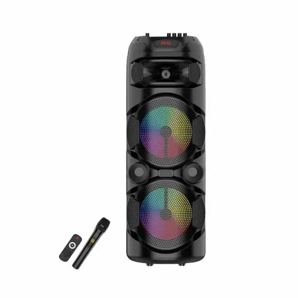 Bluetooth karaoke zvučnik sa RGB osvetljenjem pruža snažan i bogat zvuk zahvaljujući dva 8-inčna vufera sa izlaznom snagom od 40W(PMPO do 18000W). Idealan je za žurke, proslave i kućnu zabavu. Podržava Bluetooth 5.0, USB, TF/microSD kartice, AUX ulaz i FM radio, a omogućava i karaoke funkciju uz bežični mikrofon. Ugrađena 4500mAh baterija obezbeđuje do 5–10 sati rada. RGB LED svetla sinhronizovana sa muzikom stvaraju savršenu party atmosferu.