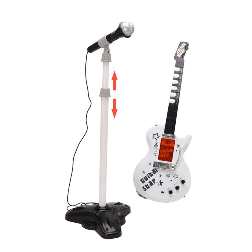 Prelepa bela električna gitara sa žicama i mikrofonom na stalku savršen je izbor za kreativnu zabavu i muzičko istraživanje vašeg deteta. Idealan je poklon za dečake i devojčice, pružajući im priliku da razviju svoje muzičke veštine i uživaju u igri.