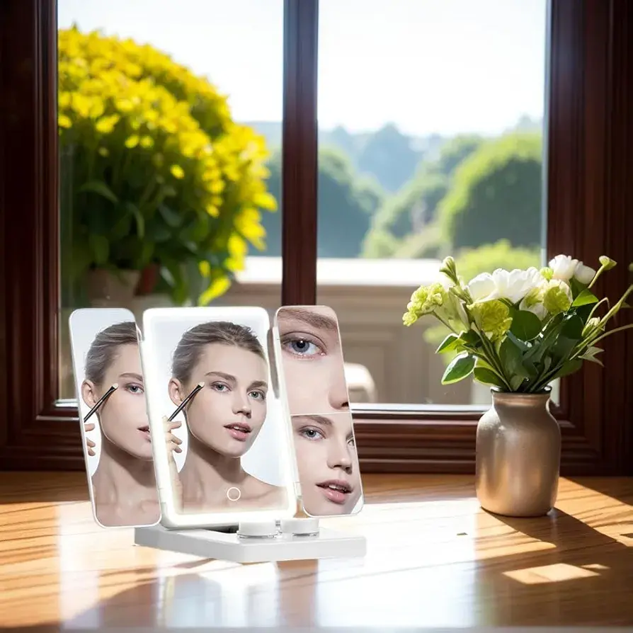 Uživajte u savršenom šminkanju uz LED trostruko ogledalo za šminku koje pruža jasan i detaljan prikaz iz svakog ugla! Sa tri panela i uvećanjem za preciznu aplikaciju, ovo praktično ogledalo za šminkanje je savršen dodatak vašem toaletnom stolu.