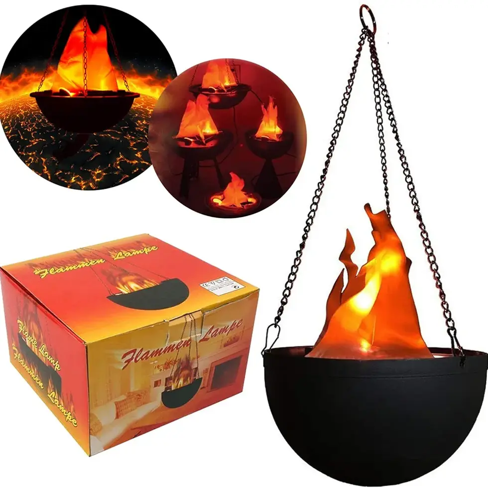 Viseća električna plamena lampa sadrži plamen od isečene tkanine osvetljen ćilibarskim svetlima postavljenim u crnu metalnu posudu obešenu lancima. Odličan je kao dekor i kompaktne je veličine da stane na većinu mesta, bez opasnosti jer vatra nije stvarna. Stvaranje tople atmosfere na svakoj lokaciji. Kreirajte sopstveni mistični plamen gde god poželite!